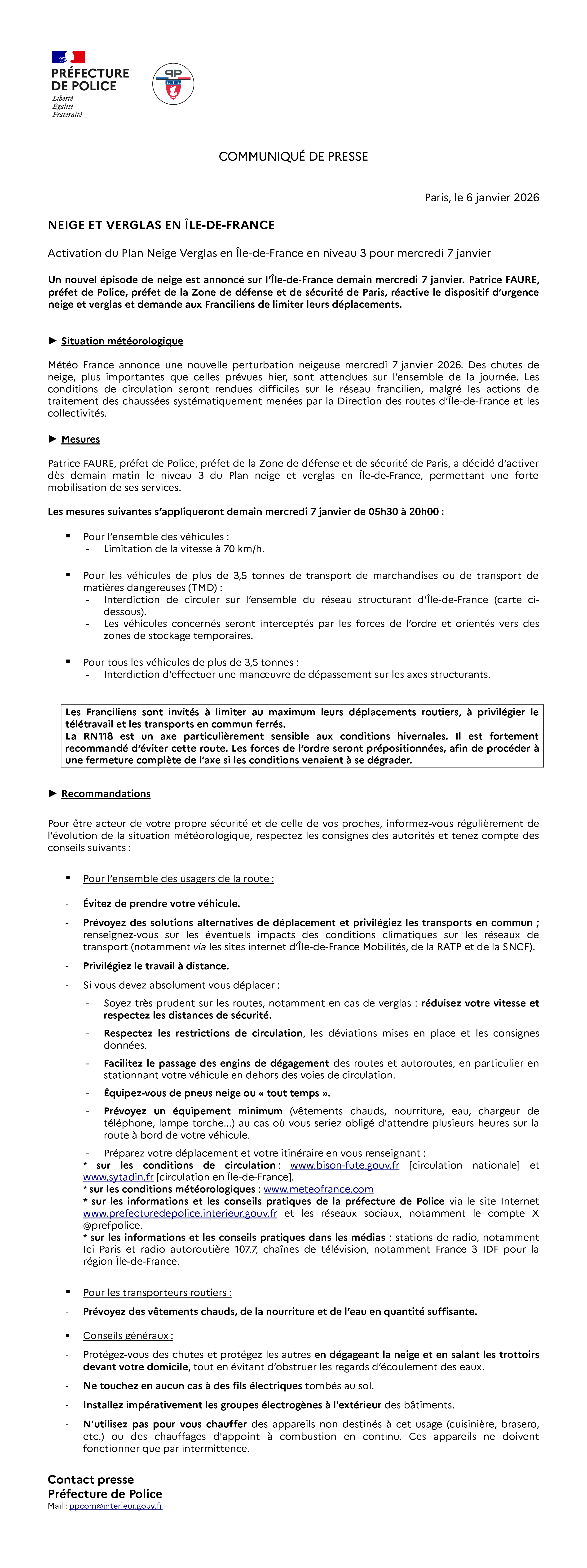 Communiqué de presse - Activation du Plan Neige Verglas en Île-de-France en niveau 3 pour le mercredi 7 janvier 2026 - Restrictions de circulation - 06 Janvier 2026 pdf - 344.6 kio