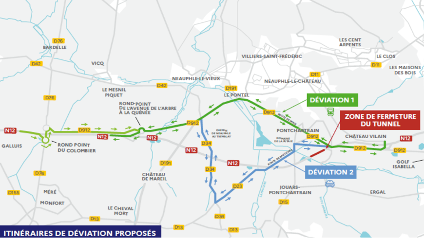 Ces fermetures aux vacances de la Toussaint permettront de poursuivre les travaux déjà engagés, à savoir la pose de plaquettes de protection au feu mais également de commencer le remplacement de l’éclairage et enfin de combler le premier puits de ventilation, qui est l’une des principales sources de nuisance sonore pour les habitants de Jouars-Pontchartrain. Dans le cadre des fermetures du tunnel, les itinéraires de déviation ci-dessous sont proposés.