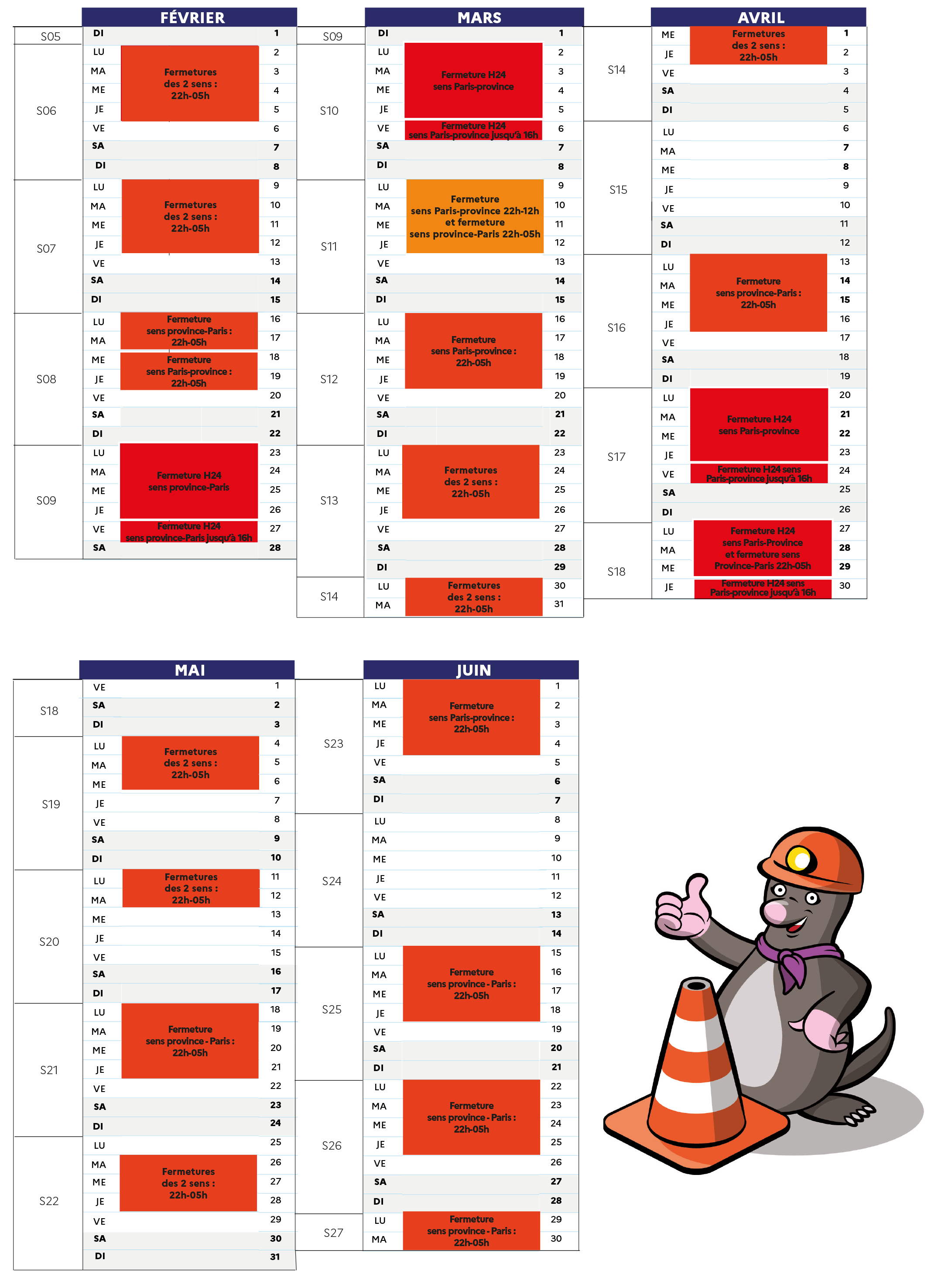 Ce type de fermetures, bien que contraignantes pour les usagers, va permettre de gagner presque un an sur la durée totale du chantier au regard de l’ampleur des travaux à mener et de réduire ainsi les impacts du chantier sur la circulation.