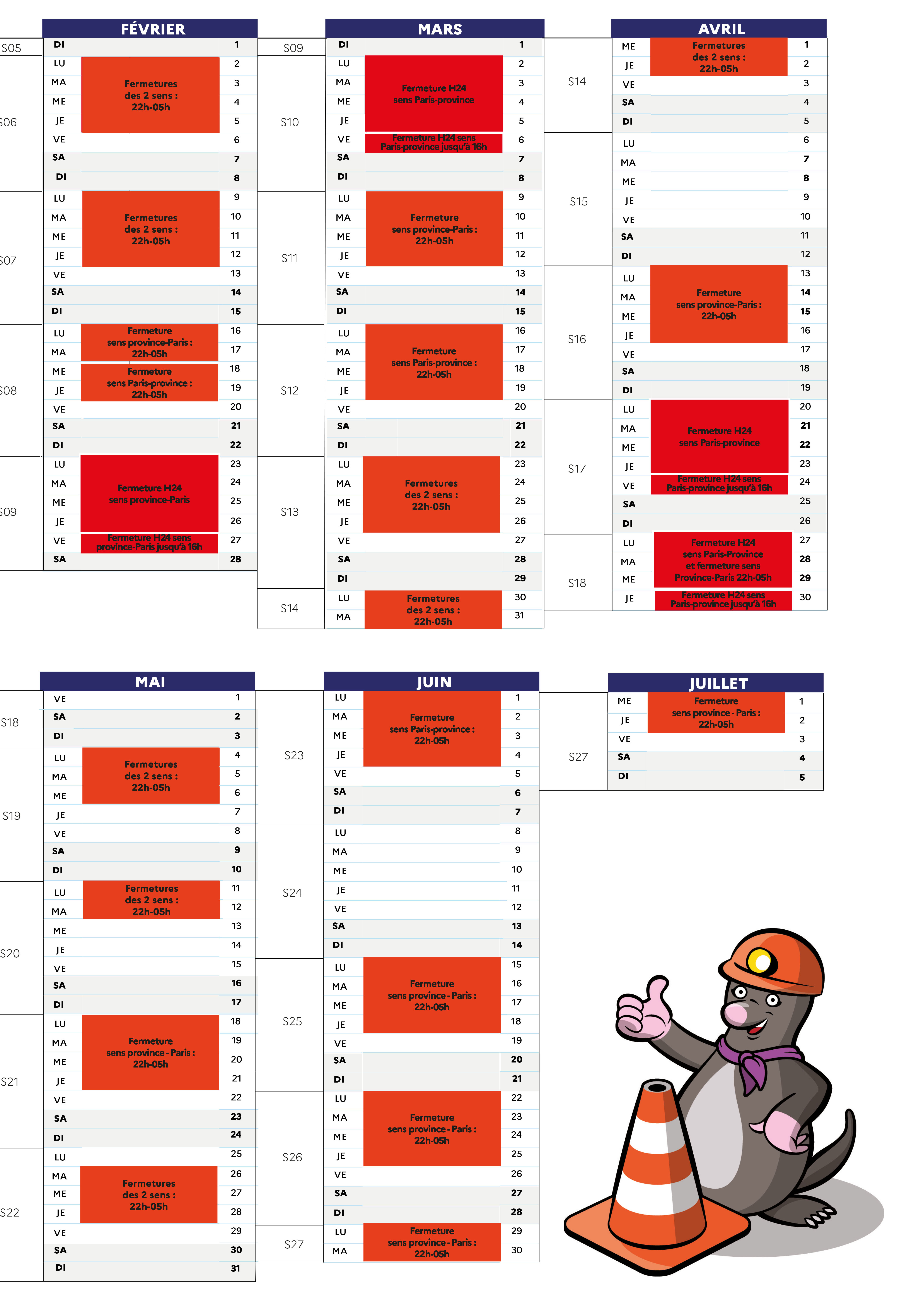 Ce type de fermetures, bien que contraignantes pour les usagers, va permettre de gagner presque un an sur la durée totale du chantier au regard de l’ampleur des travaux à mener et de réduire ainsi les impacts du chantier sur la circulation.