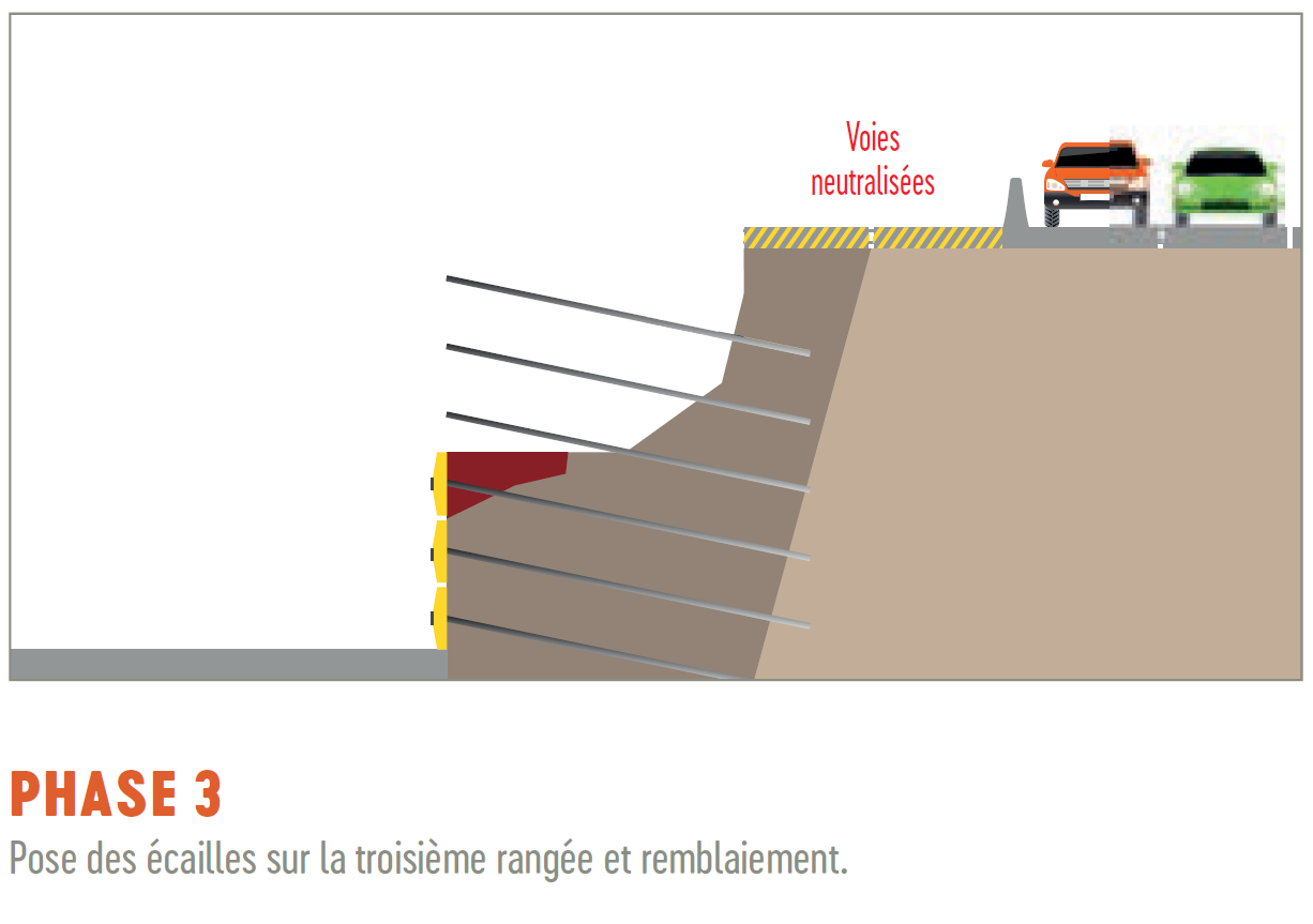 La solution technique employée a consisté à réaliser un « mur d’écailles en béton clouées ». Concrètement il s’agissait de solidifier et stabiliser le talus par l’insertion d’ancrages métalliques par rangs successifs (de bas en haut). La paroi a ensuite été renforcée par l’installation de plaques de béton préfabriquées. Au niveau de la partie haute du talus, des parois de soutènement ont été installées pour consolider l’ouvrage.