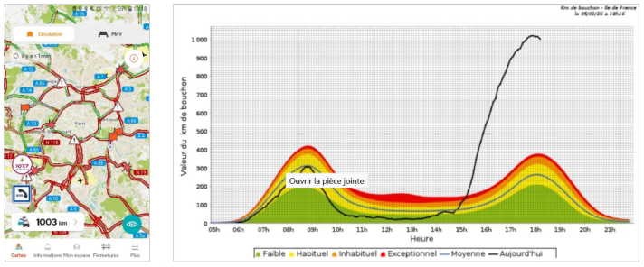Entre temps, la courbe des bouchons sur Sytadin s’envole jusqu’à franchir la barre des 1000 km de bouchons recensés sur le réseau vers 19h avant de redevenir « normal » vers 20h30. Un record historique relayé dans de très nombreux médias qui se sont interrogés sur notre méthode de calcul de bouchons ! le saviez-vous ? Le précédent record enregistré était de 737 km lors de l’épisode neigeux du 6 février 2018 !