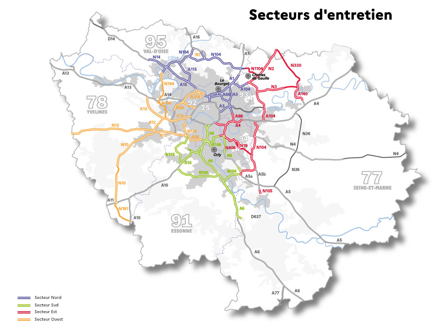 La direction des routes d’Île-de-France est chargée de l’exploitation, de l’entretien et de la modernisation des autoroutes non concédées et des routes nationales en Île-de-France. Si votre demande concerne une route communale ou une route départementale, vous êtes invités à formuler votre demande auprès de la mairie (route communale) ou auprès du conseil départemental (route départementale) concerné. Si votre demande concerne une autoroute gérée par une société privée, vous êtes invités à formuler votre demande auprès de la société concessionnaire d’autoroute concernée