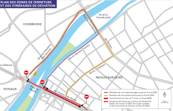 - Du 17 mars au 9 avril 2026 : Le tunnel de Neuilly sera fermé de nuit, en plus de la fermeture du pont. Un itinéraire de déviation par le pont de Courbevoie sera mis en place. Il est recommandé aux poids lourds de ne pas s’engager sur la RN13 pendant les nuits concernées.