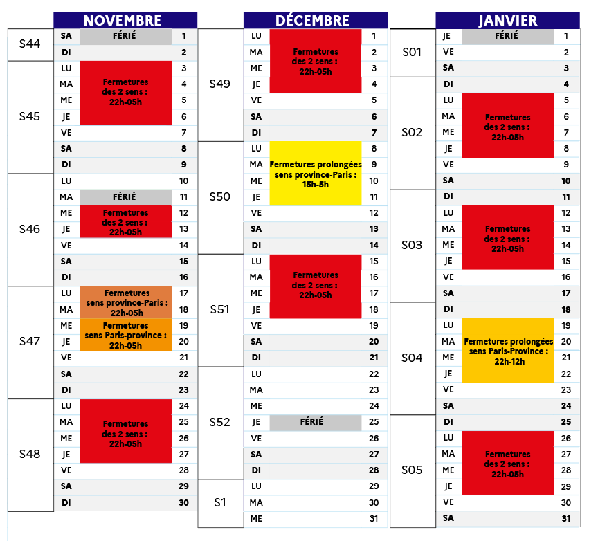 Dans cette continuité, des fermetures prolongées, limitées à 4 par mois, vont être mises en place, selon le calendrier ci-dessous, afin de terminer ces travaux le plus rapidement possible. Consultez le service Sytadinpour retrouver les informations en temps réel sur les conditions de circulation du réseau routier national francilien.