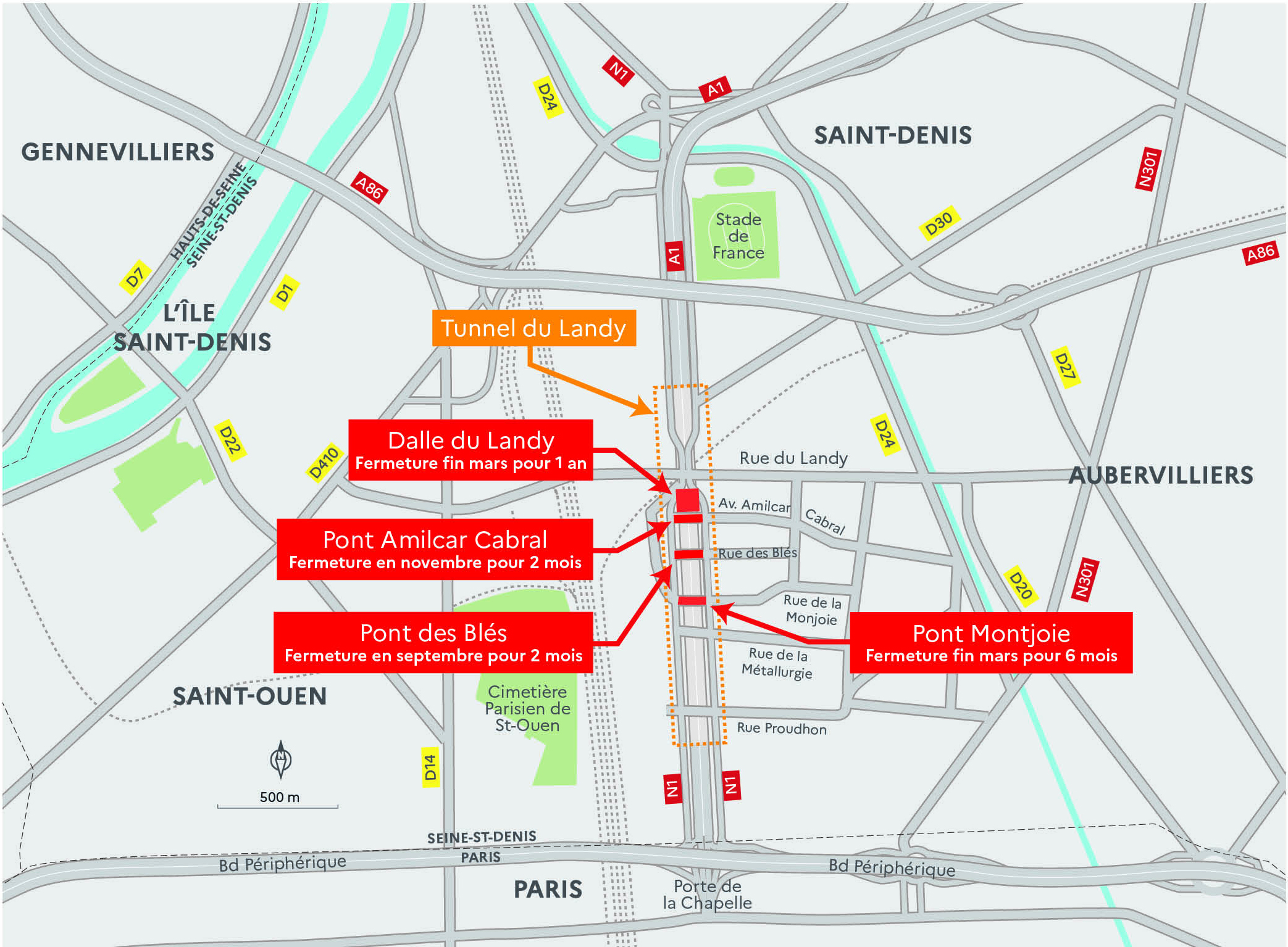 Une première phase de travaux a été menée entre 2022 et 2024 permettant de remplacer les joints de chaussée et d’engager des travaux d’étanchéité sur la partie sud de la tranchée couverte du Landy. Cette nouvelle phase du chantier, qui va se concentrer sur la partie centrale de l’ouvrage, a démarré depuis le 23 mars 2026 et se poursuivra jusqu’au début de l’année 2027.