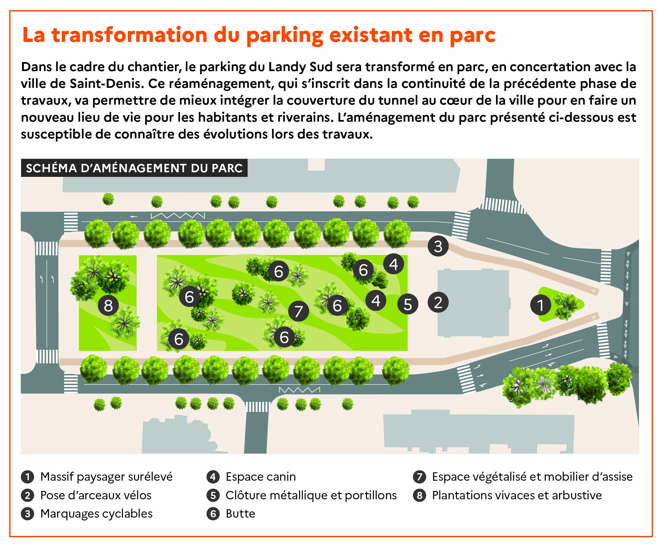 - L’actuel parking situé sur la dalle du Landy laissera place à un nouvel espace paysager. La dalle de la tranchée couverte sera rechargée en terre végétale afin de permettre la plantation d’arbres et de plantes vivaces. Du mobilier urbain, des arceaux vélos et un espace canin viendront compléter cet aménagement, créant un véritable parc urbain au cœur du secteur.